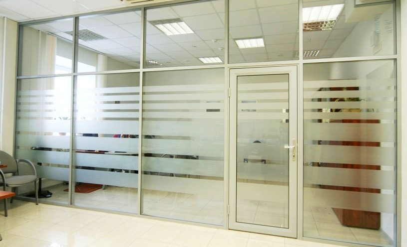 Офисные перегородки из алюминия с плёнкой на стекле для создания фирменного стиля, а также чтоб создать рабочий комфорт.
