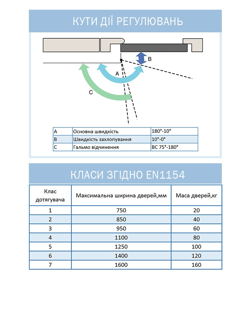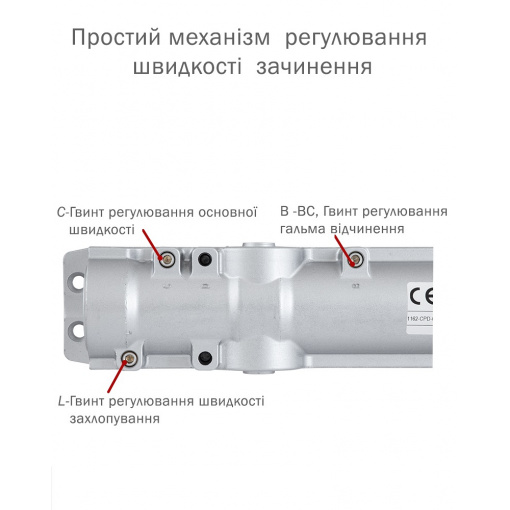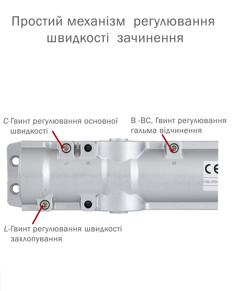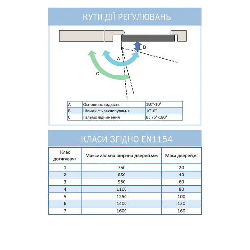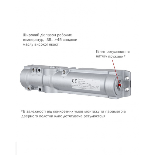 Має регулювання натягу внутрішньої пружини (клас дотягувача), що дозволяє використовувати єдину модель для різних класів дверей. Також полегшує регулювання сили закриття дотягувача, не змінюючи його положення на дверях.