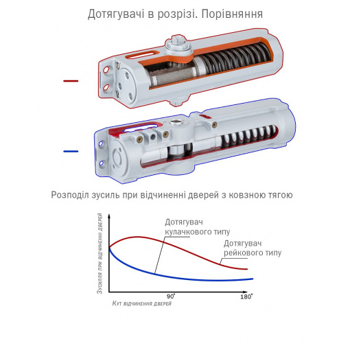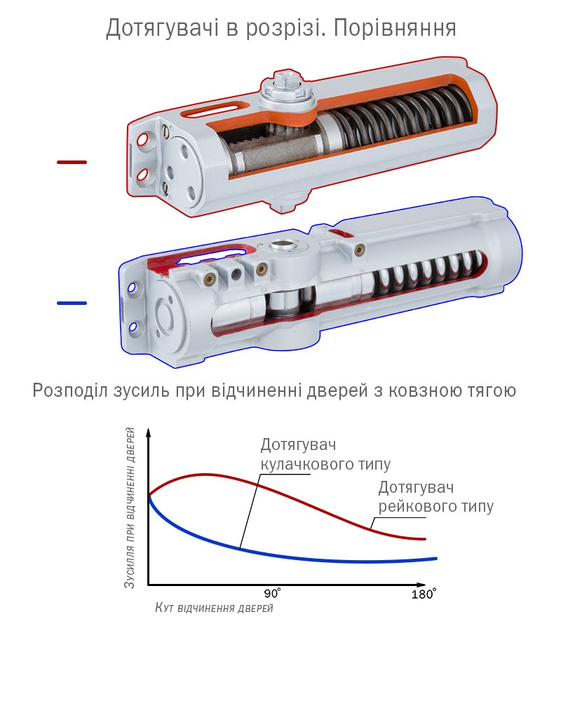 Внутрішній механізм - тип кулачкового (ексцентрик) типу (CAM), який надає дотягувачу особливих властивостей: різке падіння опори дверей при відчиненні, але досить висока сила закриття дверей. Дотягувачі такого типу працюють виключно з ковзаним типом тяги.