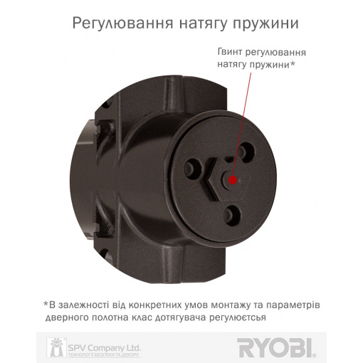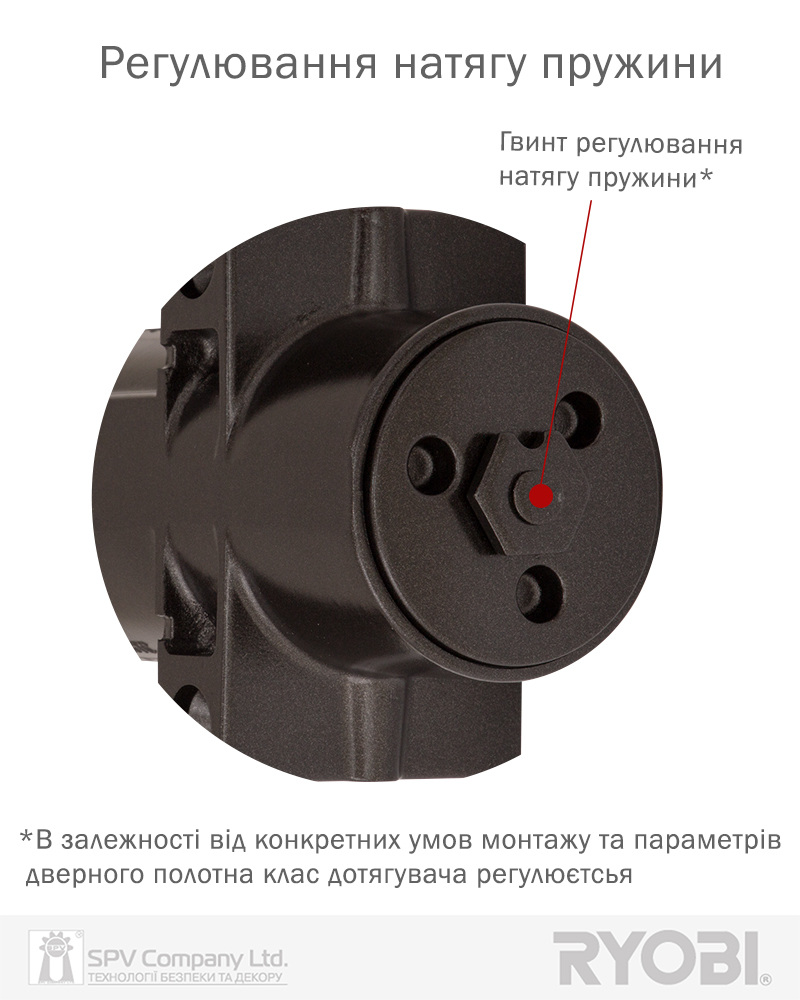 Має регулювання натягу внутрішньої пружини (класу дотягувача), що дозволяє використовувати єдину модель дотягувача до різних класів дверей. Також полегшує регулювання сили закривання дотягувача, не змінюючи його положення на дверях.
