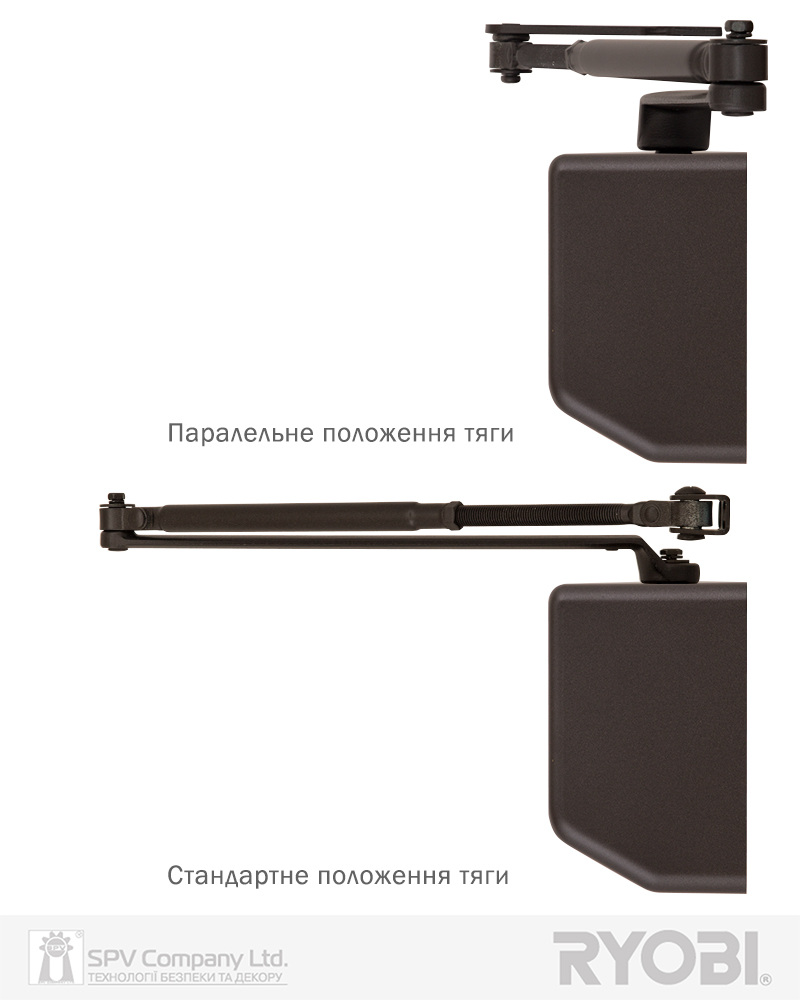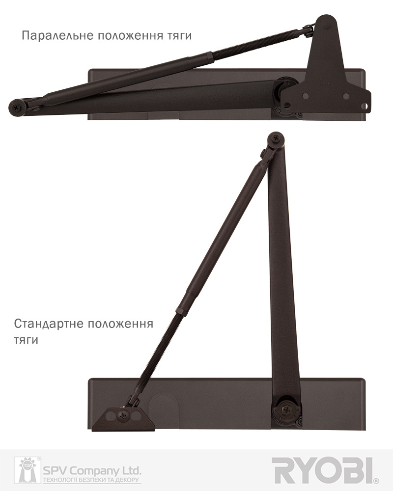 Стандартна тяга, т.з. «коліно», надає два варіанта встановлення дотягувача на дверях.