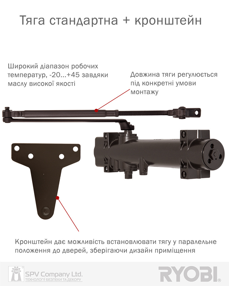 Комплектація: дотягувач, декоративна кришка, комплект кріплення, тяга стандартна, кронштейн паралельної тяги.